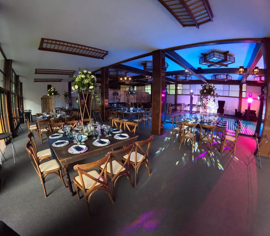 El Salón Club Japonés es un espacio interior que destaca por su fusión de estilo tradicional y contemporáneo. Su diseño se caracteriza por techos con vigas de madera oscura y plafones de estilo japonés que añaden un carácter distintivo. La ambientación se complementa con mesas rectangulares, sillas Crossback y una iluminación festiva que inunda el área de la pista de baile con tonos vibrantes (azul, magenta). Es un lugar ideal para eventos que buscan una atmósfera sofisticada, íntima y visualmente impactante.